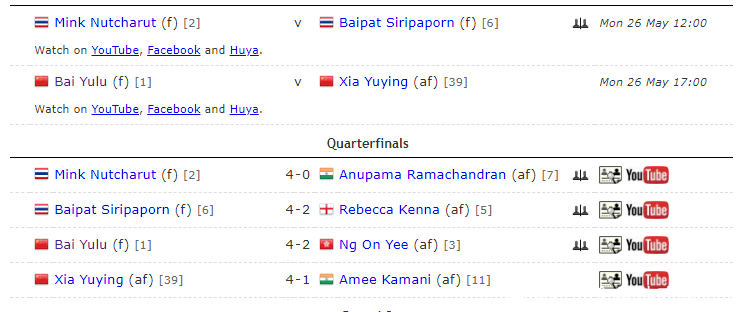 来到1/4决赛,卫冕冠军在与中国香港的世锦赛冠军吴安仪的中国德比战中,以4-2驯顺敌手晋级4强。泰国的世锦赛冠军明克-努查鲁特,以4-0的比分横扫本家巴伊帕特-西里芭侬晋级4强。