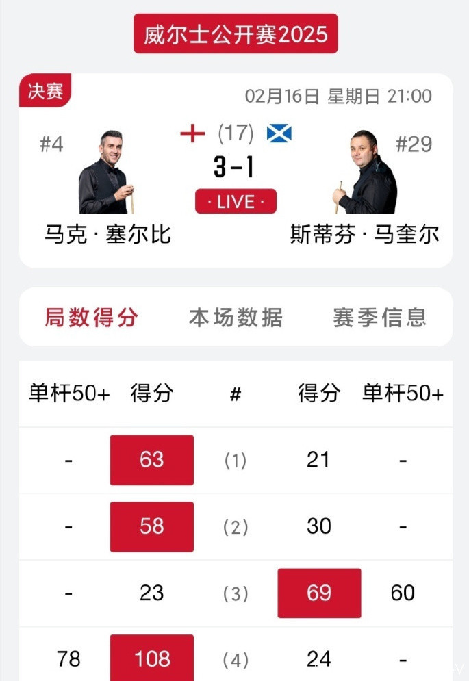 这场比赛,傅家俊轰出一杆破百(139分)和两杆50+(54分、79分),威尔逊轰出一杆破百(103分)和两杆50+(73分、66分)。